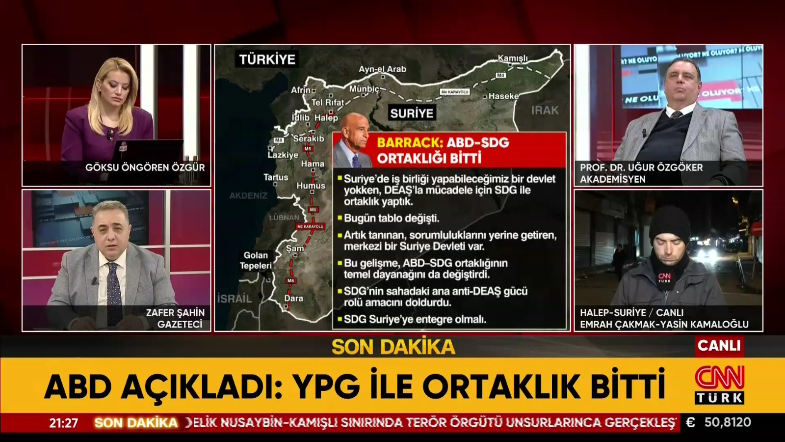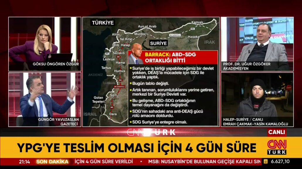 CNN Türk ekranlarında yayınlanan “Ne Oluyor?” programına konuk olan Prof. Dr. Uğur Özgöker, Amerika Birleşik Devletleri’nin Suriye politikasındaki keskin dönüşü ve SDG (PKK/YPG) ile olan ortaklığının sona ermesinin şifrelerini analiz etti. Özgöker, ABD Suriye Özel Temsilcisi Tom Barrack’ın açıklamalarıyla tescillenen bu yeni dönemi, terör örgütlerinin bölgedeki miadının dolduğunun en açık kanıtı olarak nitelendirdi. ABD’nin asıl amacının DEAŞ ile mücadele olduğunu belirten Özgöker, Suriye’de uluslararası alanda tanınan ve koalisyona katılan meşru bir merkezi yönetimin varlığının, terör örgütlerini aparat olarak kullanma gerekliliğini ortadan kaldırdığını ifade etti.