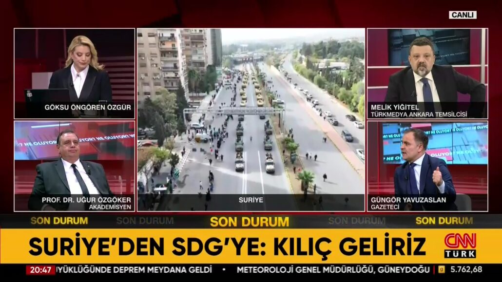 Programda Suriye’deki yeni gerilim hattı, Şam yönetiminin SDG’ye (Suriye Demokratik Güçleri) yönelik “Kılıçla geliriz” açıklaması ve bu söylemin bölgesel dengelere etkileri tartışılmıştır. Prof. Dr. Uğur Özgöker, bu çıkışın yalnızca askeri bir tehdit değil, bölgesel güçler arasında yeniden şekillenen ittifakların da habercisi olduğunu belirtmiştir.