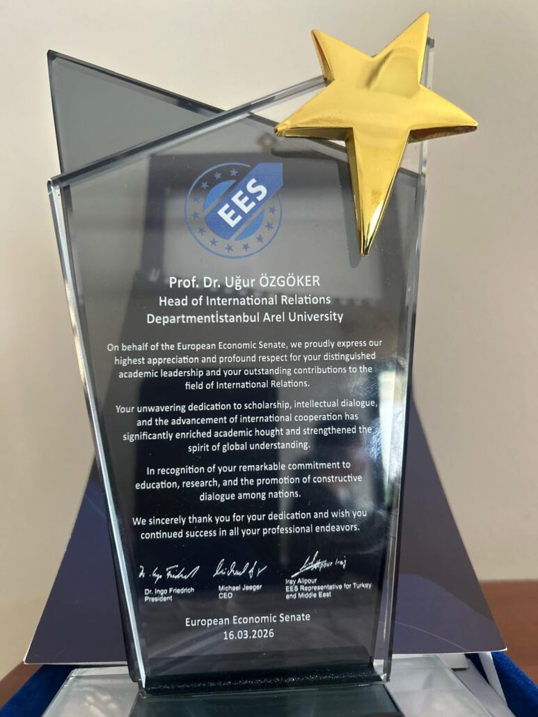 A formal ceremony was held at İstanbul Arel Üniversitesi to honor Professor Dr. Uğur Özgöker, during which a commemorative plaque was presented on behalf of the European Economic Senate by Senator Iraj Alipour and his team in recognition of his distinguished academic and international contributions.
