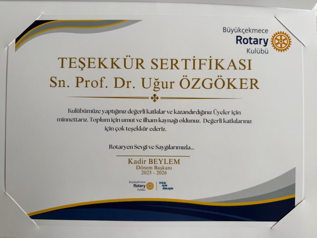 Prof. Dr. Uğur Özgöker’e ROTARY MESLEKTE ONUR ÖDÜLÜ Verildi